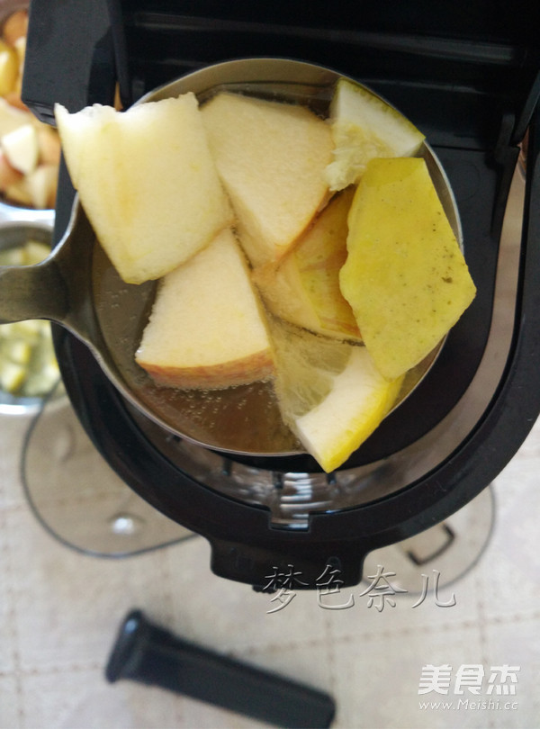 3. 原汁機(jī)裝細(xì)網(wǎng),先放一些蘋(píng)果進(jìn)機(jī)里,再勺水果酒混合,一邊榨一邊勺